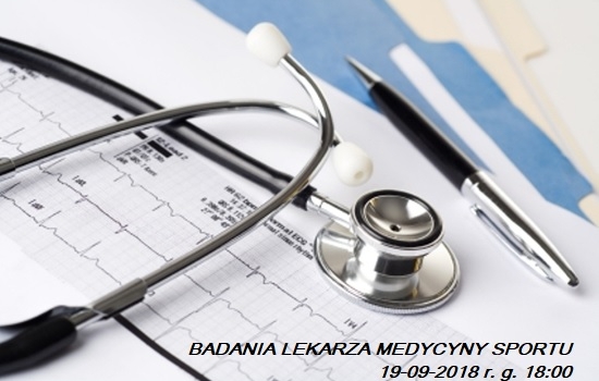 W dniu jutrzejszym (19.09.2018 r.) o godzinie 18:00 w klubie odbędą się badania lekarza medycyny sportu. Zapraszamy wszystkich zawodników. Prosimy o zabranie: poprzednich kart zdrowia, ostatnich wyników badań krwi, moczu, EKG oraz wszelkiej dokumentacji przebytych urazów i chorób. Koszt: 50,00 zł.