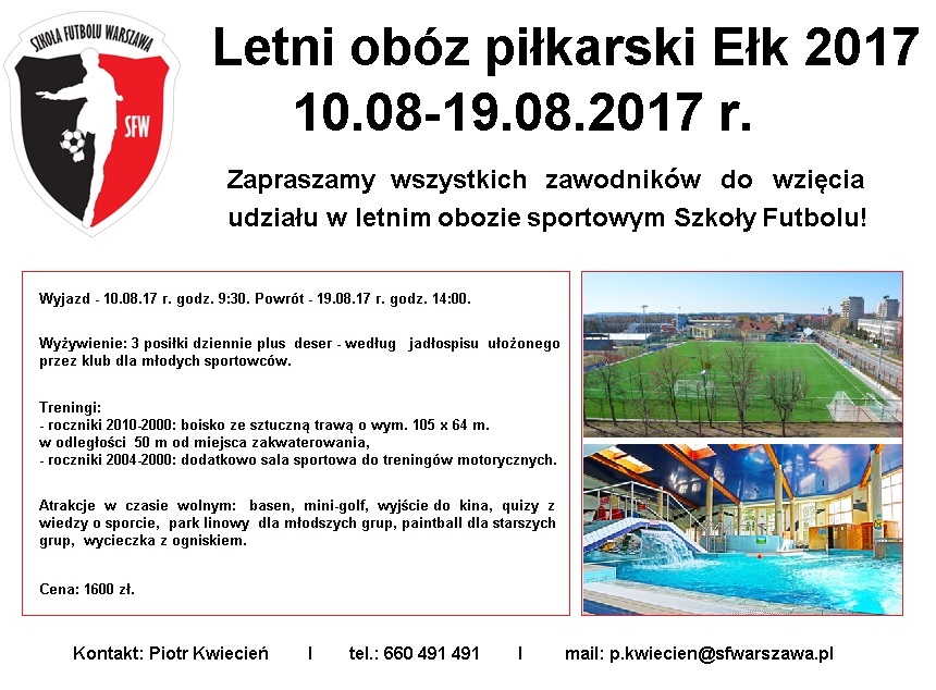 Poniżej szczegóły oferty obozu sportowego Szkoły Futbolu - EŁK 2017, na który wyjeżdżamy w środę 10 sierpnia!